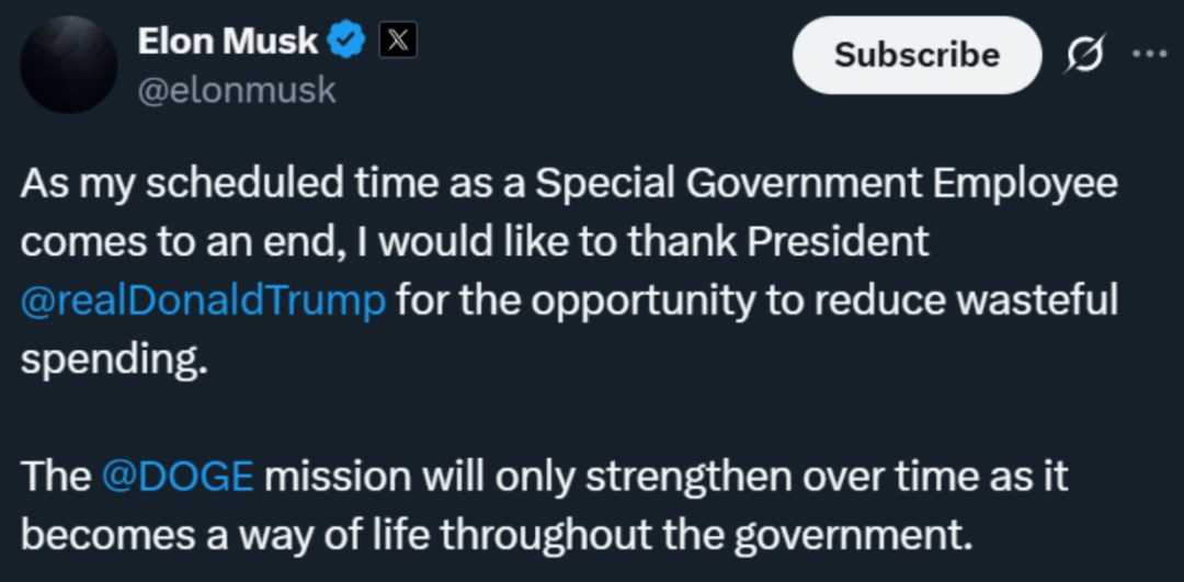 然而,在科技和商业领域大放异彩的马斯克,近期也在政坛有所动作。当地时间5月28日,马斯克在社交媒体平台X上宣布,他将离开特朗普政府,不再担任特别政府雇员一职。尽管如此,他表示政府效率部(DOGE)团队将继续在政府内部发挥作用。