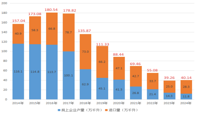 图为我国规上企业葡萄酒产量与进口量对比,显示进口葡萄酒的增长趋势。