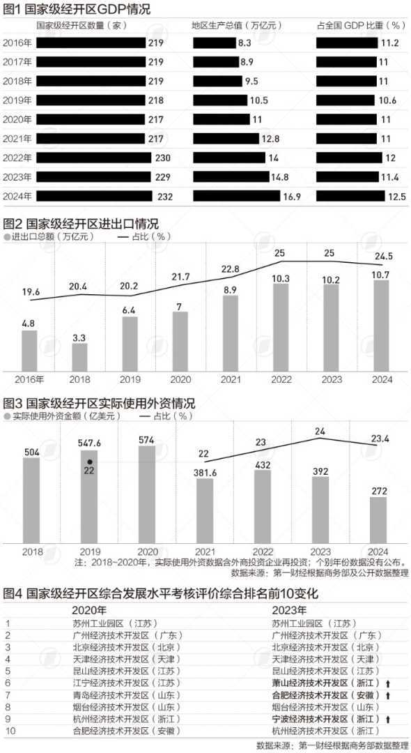 作为外贸外资的“第一梯队”,国家级经济技术开发区经过40多年的发展,到2024年,地区生产总值已达16.9万亿元,占全国GDP比重为12.5%,在推动经济增长中扮演着重要角色。