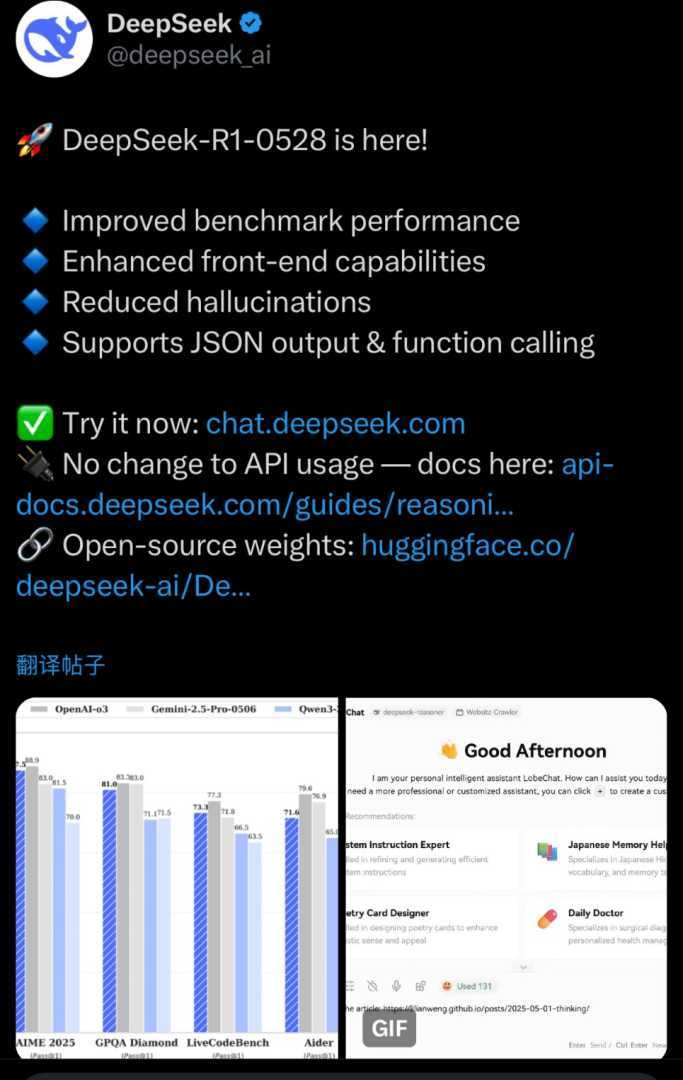 在开源平台HuggingFace上发布R1模型的更新后,5月29日晚,Deepseek终于发布了官方公告,详细介绍这次版本的具体能力迭代细节,如深度思考能力强化、幻觉改善和创意写作优化等。