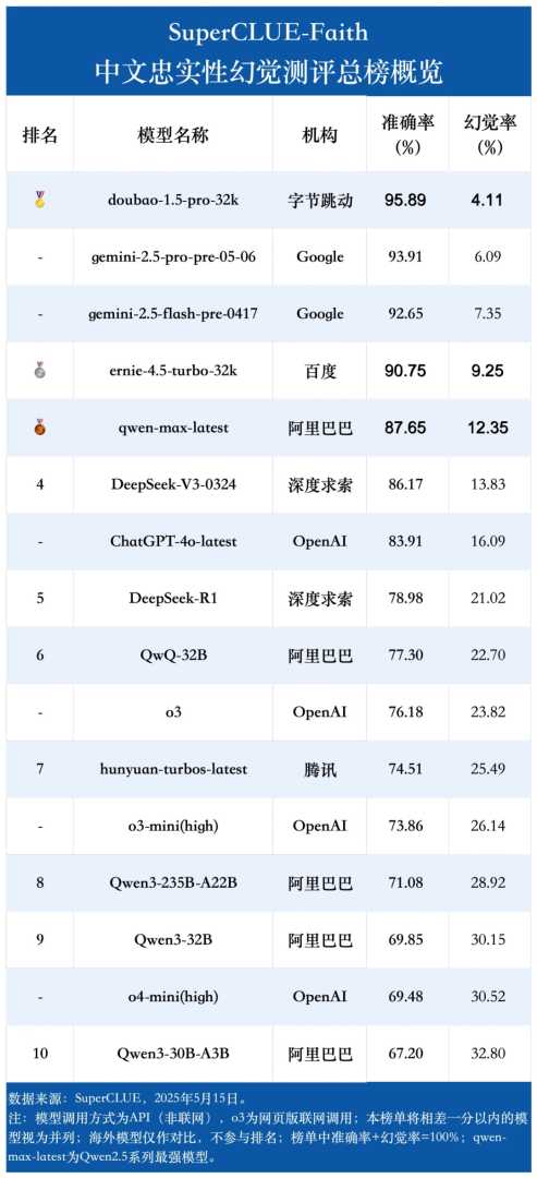 所谓幻觉,即大模型的“胡说八道”。此前,DeepSeek的幻觉率问题备受关注。SuperCLUE的测评显示,DeepSeek-R1模型的幻觉率约为21%,排名国内第五。而推理模型的平均幻觉率高于非推理模型。