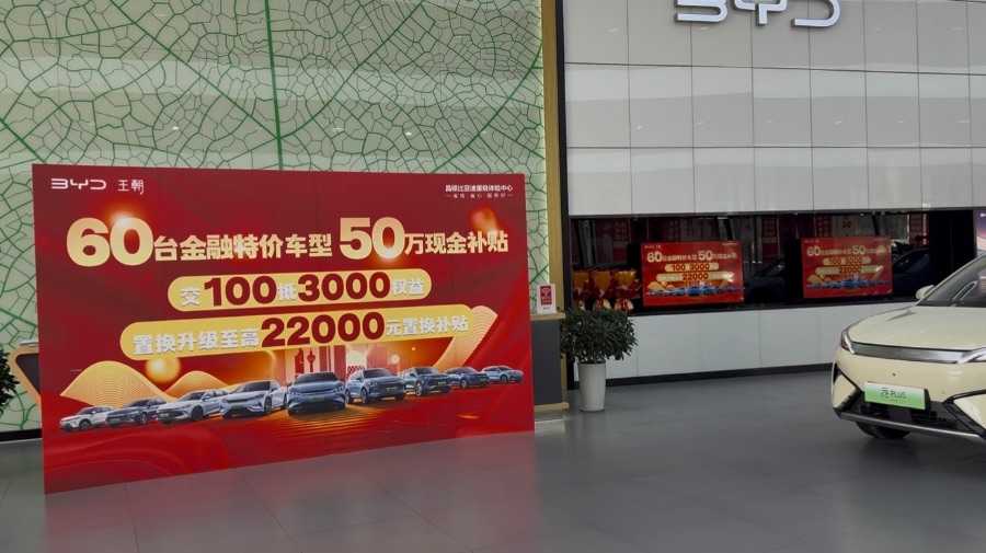 济南昌硕汽车4S店,促销标识醒目,包括金融特价车型、现金补贴、置换补贴。以比亚迪一款9.98万元车为例,享比亚迪8000元置换补贴,4S店1万元优惠,政府补贴可选报废车辆“国补”2万元或置换新车“省补”1万元,优惠或补贴总计2.8-3.8万元。结合车贷首付比例降低,部分消费者首付低,甚至“零首付”。