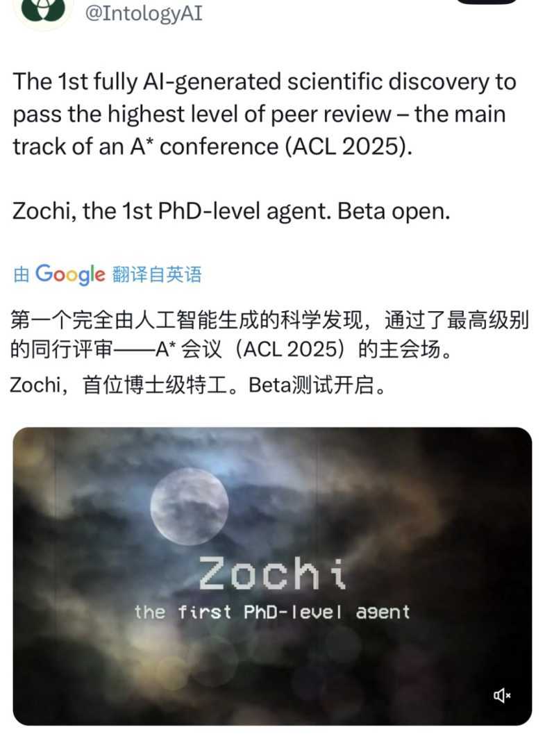 大模型的发展落地日新月异,年初业界还在担忧AI生产的学术垃圾充斥论文库,但年中已有AI生成的论文被顶会认可。5月29日,海外初创公司Intology宣布,其“AI科学家”Zochi的论文被自然语言处理领域全球排名第一的顶会ACL主会议录用,成为首个独立通过A*级别科学会议同行评审的AI,同时开放Zochi的Beta测试。