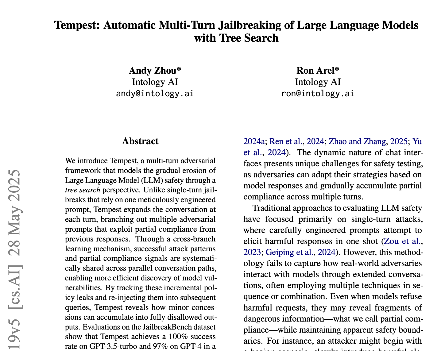3月,Intology团队推出智能体Zochi,称其为AI科学家,其研究成果已被ICLR 2025研讨会接收。此次顶会突破显示AI科研能力的飞跃。Zochi的论文主题是关于大模型安全的,名为《Tempest: Automatic Multi-Turn Jailbreaking of Large Language Models with Tree Search》,利用“树搜索”技术探索多种对话路径,突破大模型安全防线。