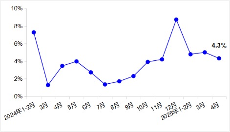 4月,完成港口货物吞吐量15.3亿吨,同比增长4.8%。内、外贸吞吐量同比分别增长5.5%和3.4%,集装箱吞吐量增长7.0%,显示港口贸易活跃。