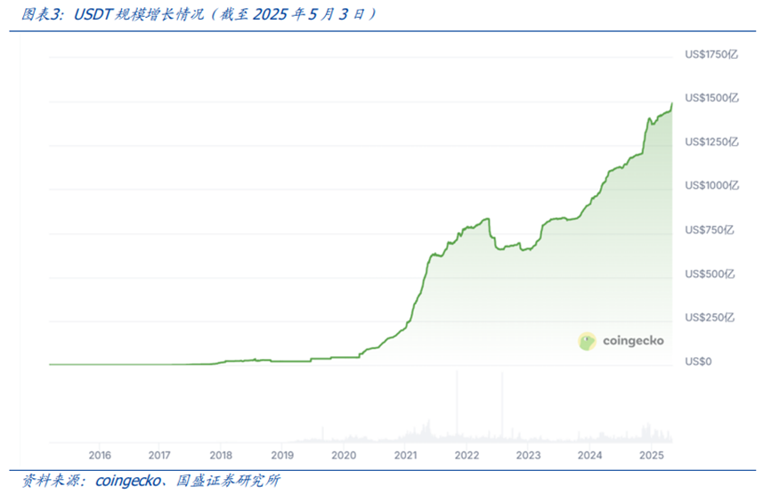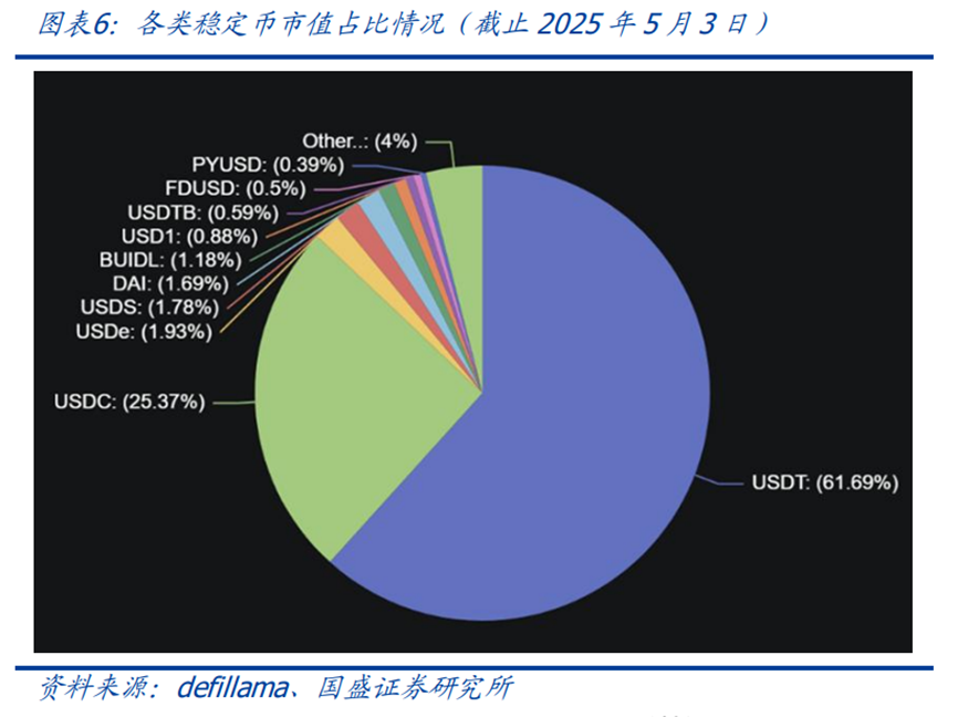 国盛证券指出,稳定币在加密货币市场中扮演着重要角色,成为主流交易所的交易对之一。特别是交易量较大的期货合约,几乎都以USDT等稳定币为主。