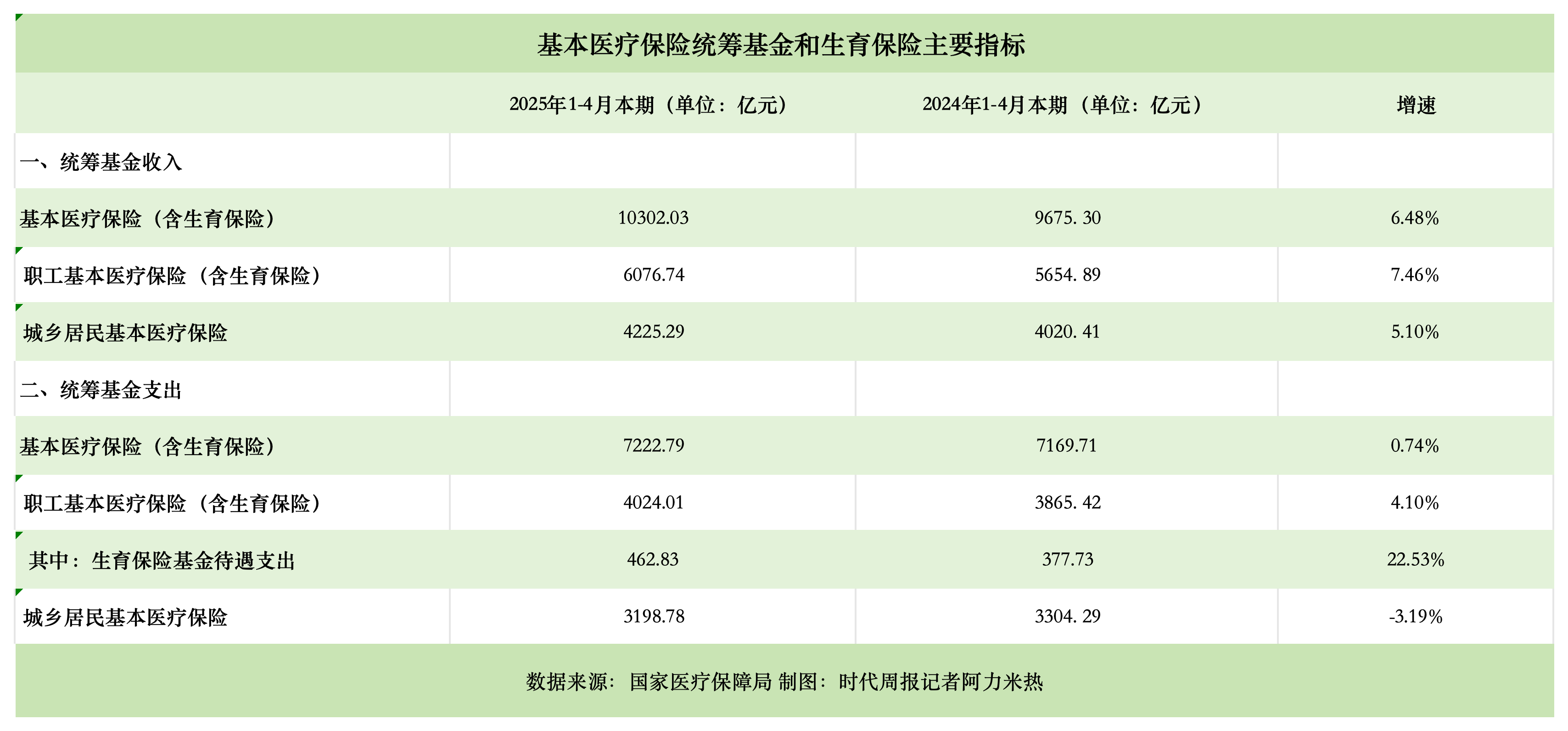 5月26日,国家医疗保障局公布了2025年1—4月基本医疗保险统筹基金和生育保险主要指标。数据显示,1-4月基本医疗保险基金(含生育保险)收入、支出分别为10302.03亿元、7222.79亿元,分别同比增长6.48%、0.74%。