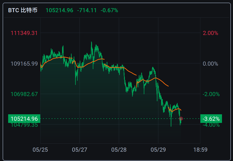 5月30日,数字货币市场经历剧烈波动。比特币在突破11万美元高点后连续回调,最新报价约为105200美元/枚。