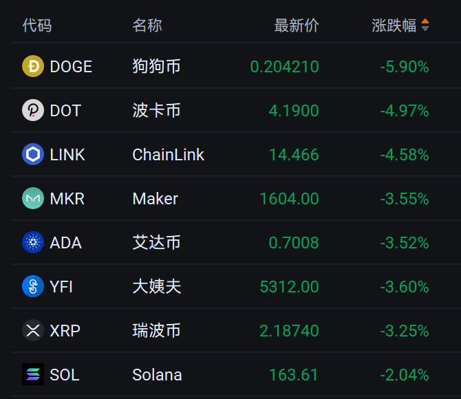 此外,其他数字货币同样遭遇暴跌,狗狗币跌幅接近6%。
