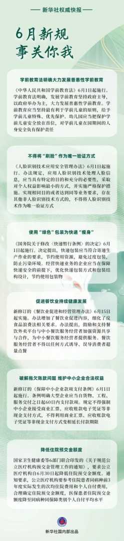 事关学前教育、“刷脸”识别、快递包装……6月起,一批新规将施行,涉及你我生活的方方面面。以下是详细解读,看你最关注哪条新规?