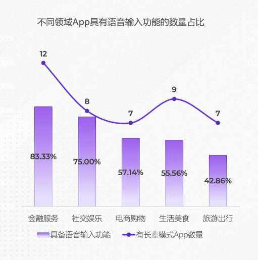 语音识别和播报功能成为适老化重要方向。63.04%配备长辈模式的App提供语音输入,金融、社交、电商类配备比例高。大部分金融服务类App及微信等配置了语音播报。