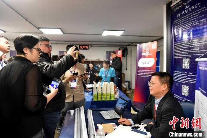 当地时间5月31日,在巴西圣保罗举行的第七届巴西中资企业人才招聘会上,求职者在扫描中企招聘信息二维码。中新社记者林春茵摄