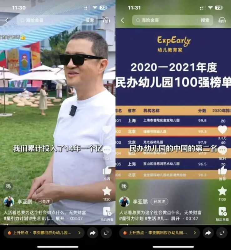 知名演员李亚鹏宣布将培德书院幼儿园无偿移交给资深教育家管理,该园曾投入1亿元。同时,其持股的丽江雪山投资被执行244万元,并被限制高消费。近年来,李亚鹏开始闯荡短视频和直播带货圈,坚持还债。