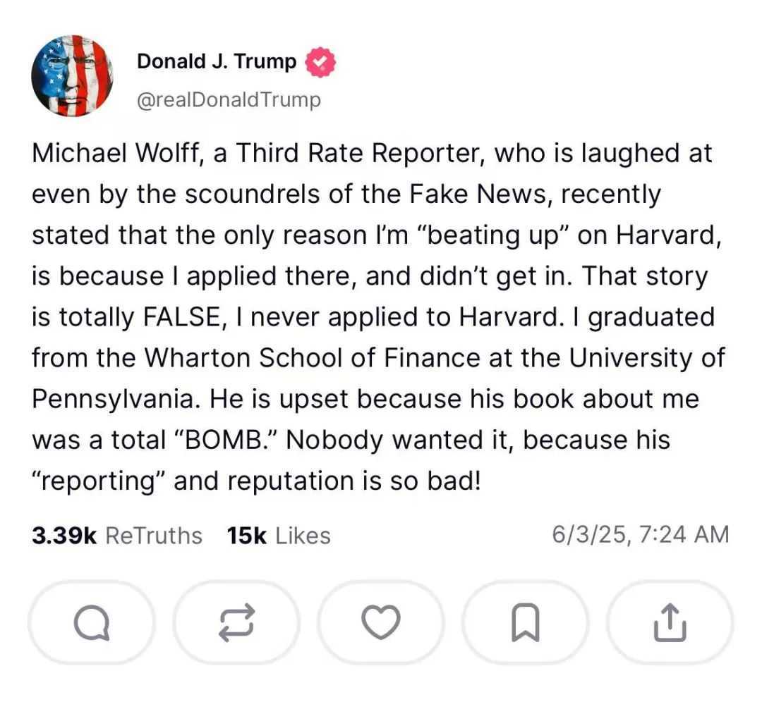 特朗普2日在社交媒体上否认了因申请入学被拒而“死磕”哈佛大学的传言,称自己从未申请过哈佛,毕业于宾夕法尼亚大学沃顿商学院。