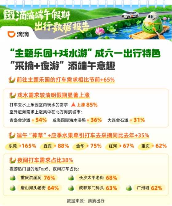 六一遇端午,主题乐园成为热门去处,滴滴打车需求上涨65%,济南方特等乐园需求大涨。亲水出行需求增加,水上乐园打车需求较清明假期上涨85%。