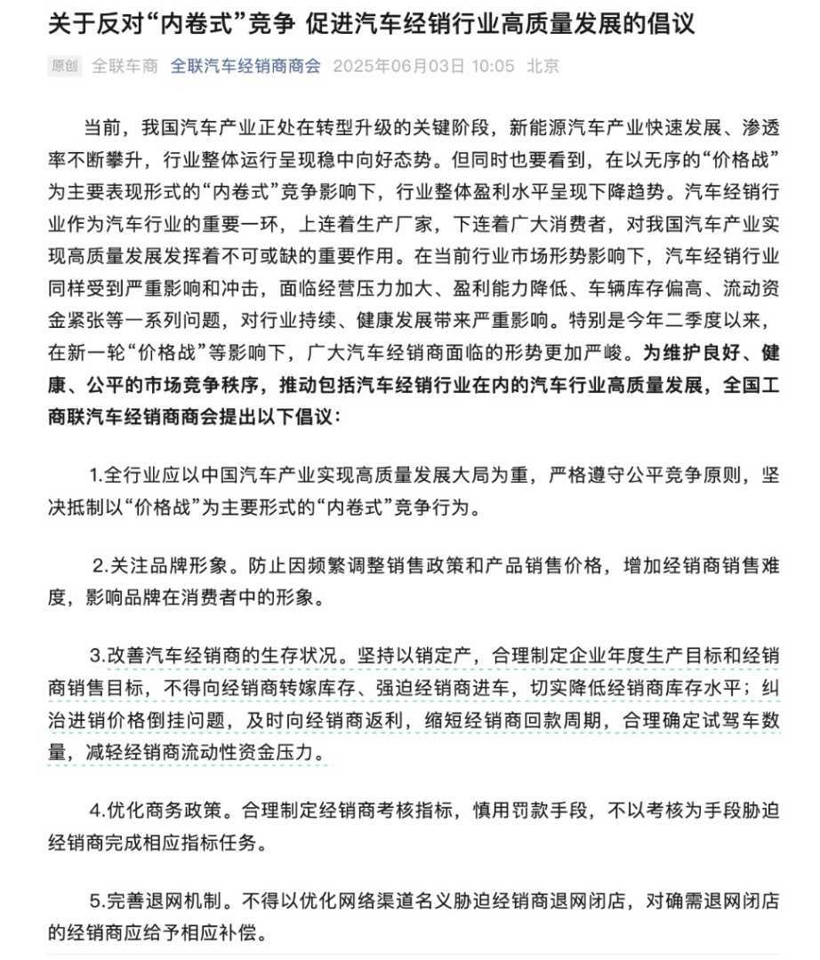 全国工商联汽车经销商商会发布倡议,反对“内卷式”竞争,提出关注品牌形象、改善汽车经销商生存状况等倡议。中国汽车工业协会也呼吁维护公平竞争秩序,工业和信息化部将加大整治力度,推动汽车产业高质量发展。