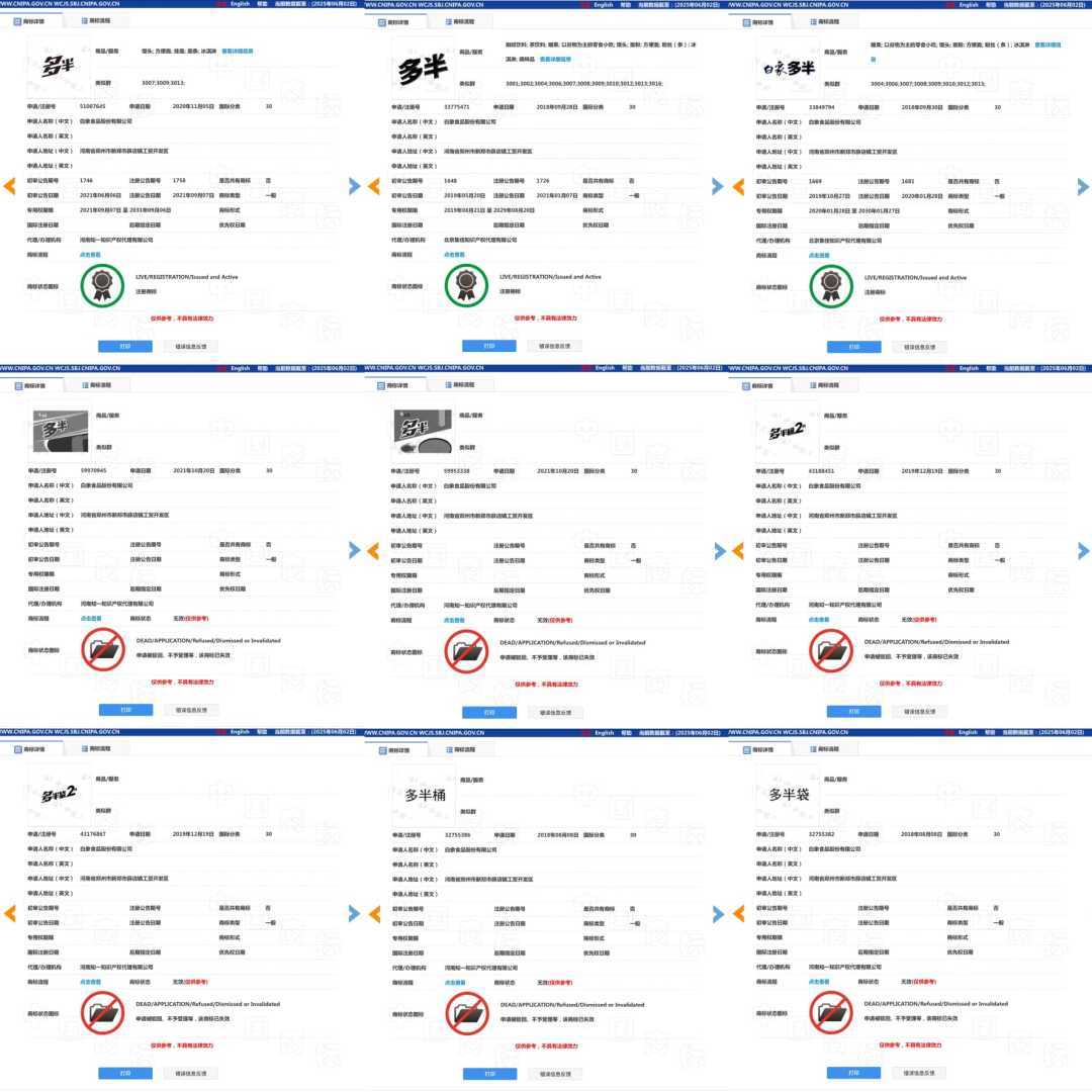 记者在中国商标网查询发现,白象曾申请注册多枚含“多半”的商标,部分注册成功。其中,“多半桶”“多半袋”等商标申请未成功。在某电商平台白象官方旗舰店,白象多半袋面的品牌名为“白象多半牌袋面”。