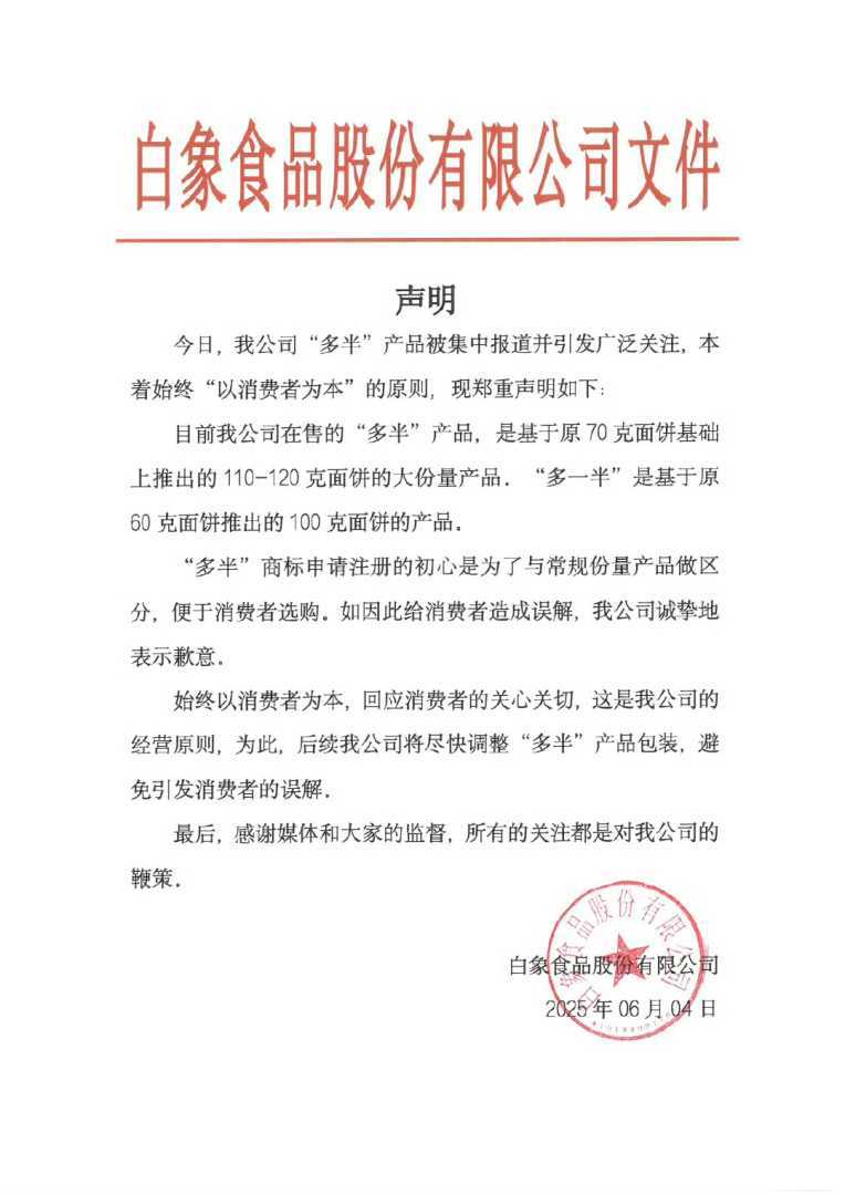 6月4日晚,白象发布声明称,在售的“多半”产品是基于原70克面饼基础上推出的110至120克大份量产品,将尽快调整包装以避免误解。