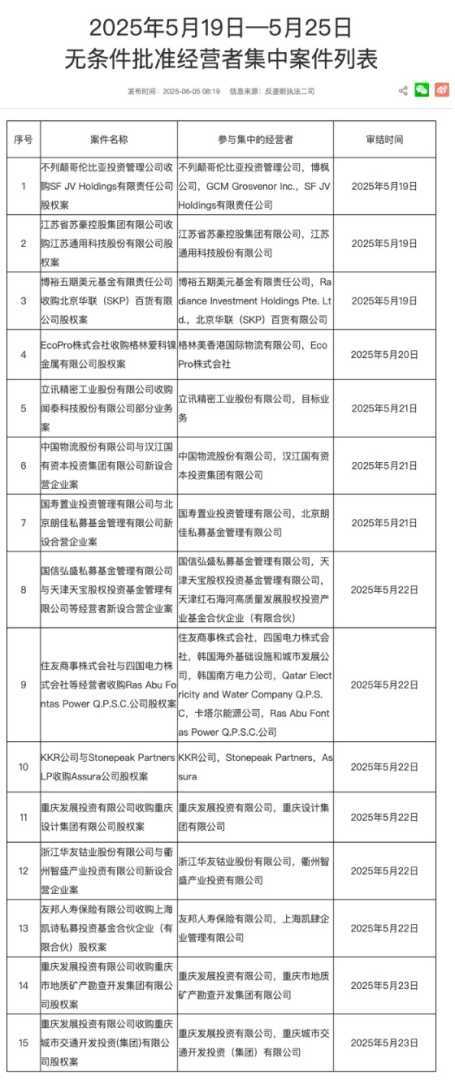 市场监管总局发布了2025年5月无条件批准的经营者集中案件列表,包括不列颠哥伦比亚投资管理公司收购SF JV Holdings股权案、江苏省苏豪控股集团有限公司收购江苏通用科技股份有限公司股权案等,显示了资本市场活跃度的提升。