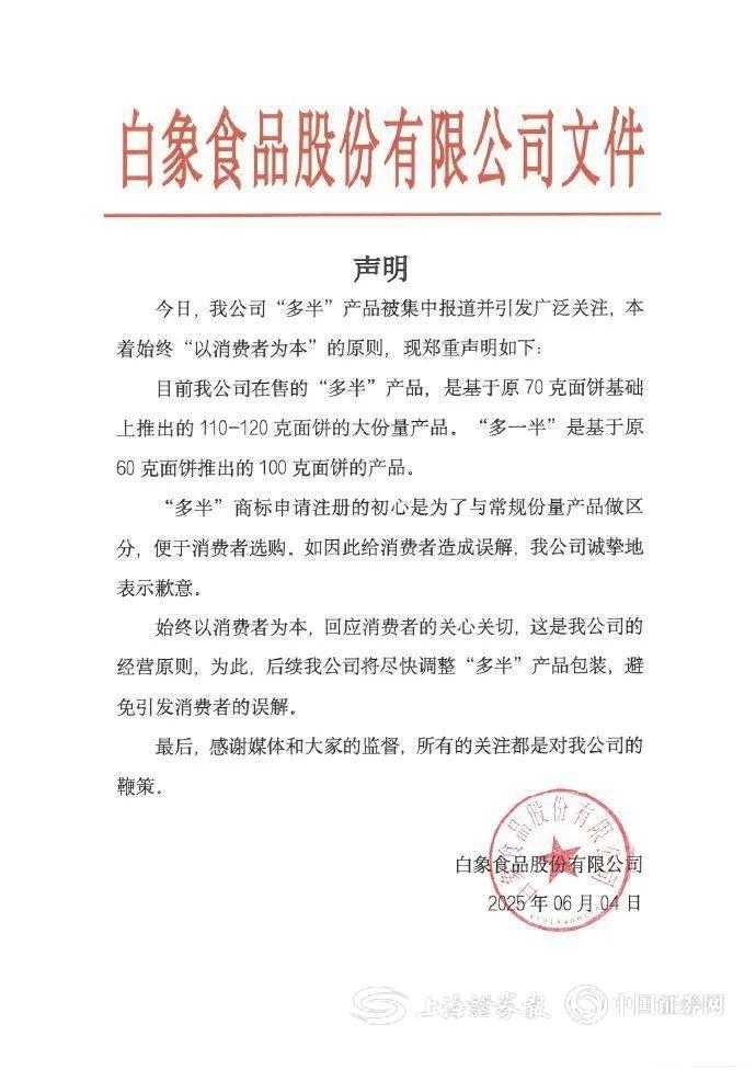 白象食品发布声明回应,目前公司在售的“多半”系列产品,是在原70克面饼基础上升级为110—120克面饼的大份量产品,而“多一半”系列则是基于原60克面饼推出的100克面饼产品。“多半”商标注册的初衷是为了与常规份量产品区分,便于消费者选购。若因此造成消费者误解,公司深表歉意,并承诺将尽快调整产品包装,避免误导消费者。