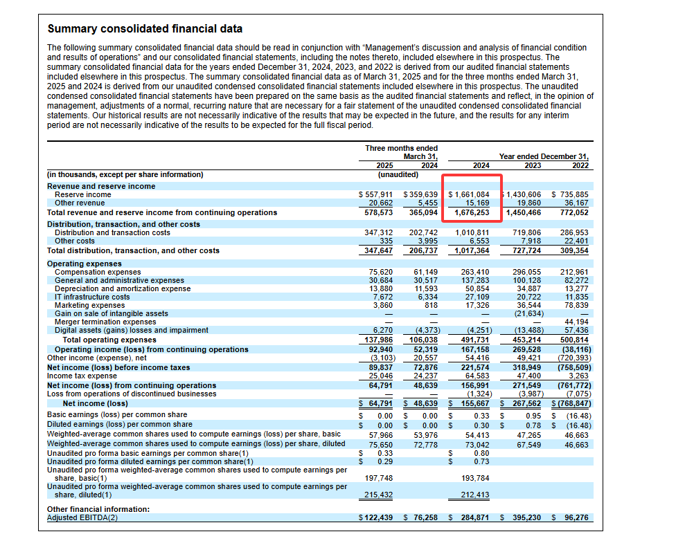 Circle的盈利模式是简单的“吃利息”,每一枚发行的USDC都有1美元的法定货币储备支持。Circle将这些储备金存放于安全的短期资产中,例如美国银行存款和由贝莱德管理的短期美国国债基金,在高利率环境下可产生可观的利息收益。根据招股书数据,2024年Circle总营收约16.76亿美元,其中99%来自USDC储备产生的利息收入。