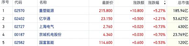 截至收盘,重塑能源(02570.HK)涨超5%,亿华通(02402.HK)跟涨逾2%,上海电气(02727.HK)、国富氢能(02582.HK)也跟随上涨。