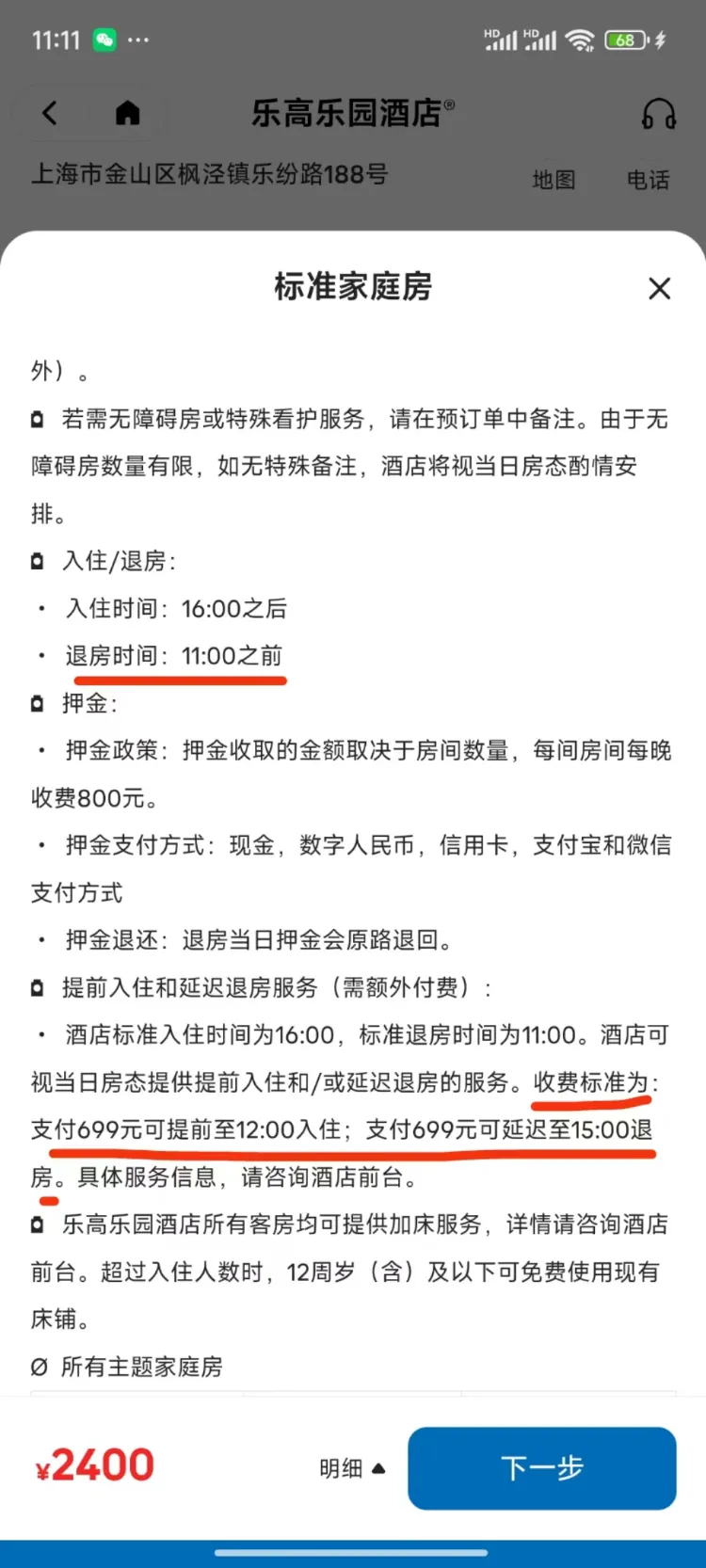 酒店方面明确表示,无论是提前入住还是延迟退房,均需付费699元。这一规定在上海乐高乐园度假区APP的酒店预订页面也有明确标注,入住时间16:00以后,退房时间11:00以前,若需提前入住或延迟退房,则需额外付费。记者发现,无论是何种房型,入住时间均显示为下午4时以后,退房时间均为上午11时以前。