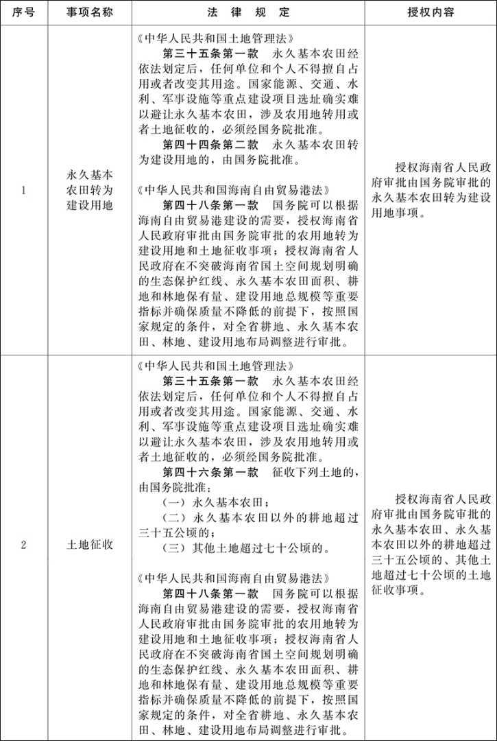 国务院正式批复,旨在全力支持海南全面深化改革开放和自由贸易港建设,决定自批复印发之日起,于海南自由贸易港范围内,正式授权海南省人民政府独立审批原由国务院审批的永久基本农田转为建设用地项目,以及土地征收项目。
