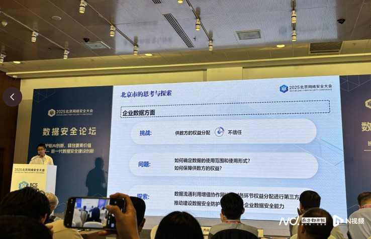 2025北京网络安全大会举办数据安全论坛,北京政数局数据标准与安全处处长刘国伟分享政府部门对于个人数据、企业数据和公共数据流通安全治理的探索,包括个人数据匿名化标准、公共数据授权形式及收费政策、企业数据流通信任关系等。