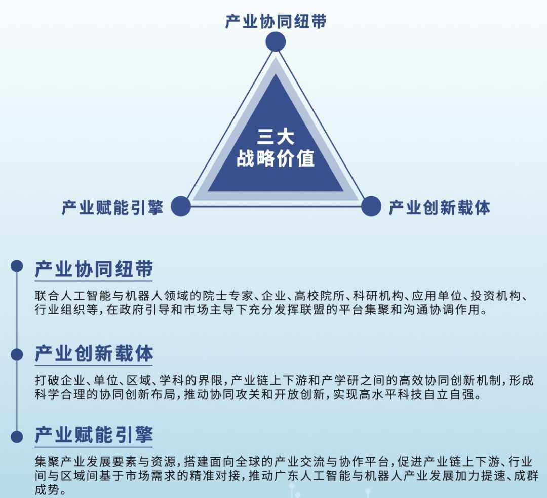 在政策支持和产业发展的双重驱动下,广东省人工智能与机器人产业联盟的成立具有三大战略价值:作为产业协同纽带,将联合多方力量,发挥平台集聚和沟通协调作用;作为产业赋能引擎,将集聚产业发展要素与资源,推动产业链上下游精准对接;作为产业创新载体,将打破界限,形成科学合理的协同创新布局。