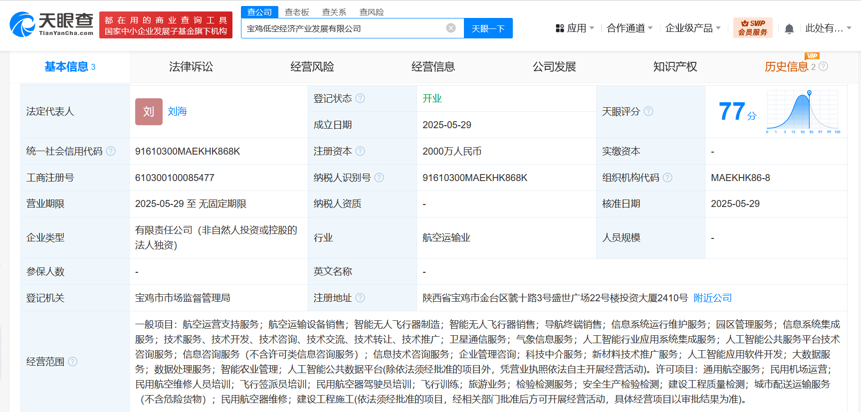 宝鸡低空经济产业发展有限公司正式成立,注册资本2000万人民币,经营范围广泛,涵盖航空运营支持服务、智能无人飞行器制造与销售等,展现出强大的综合服务能力,标志着宝鸡市在低空经济领域的深入布局。