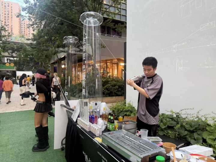 多个沉浸式体验区域创意满满,包括夜购板块的香水瓶与酒箱礼盒超现实放大重构、夜食板块的咖啡鸡尾酒制作等。