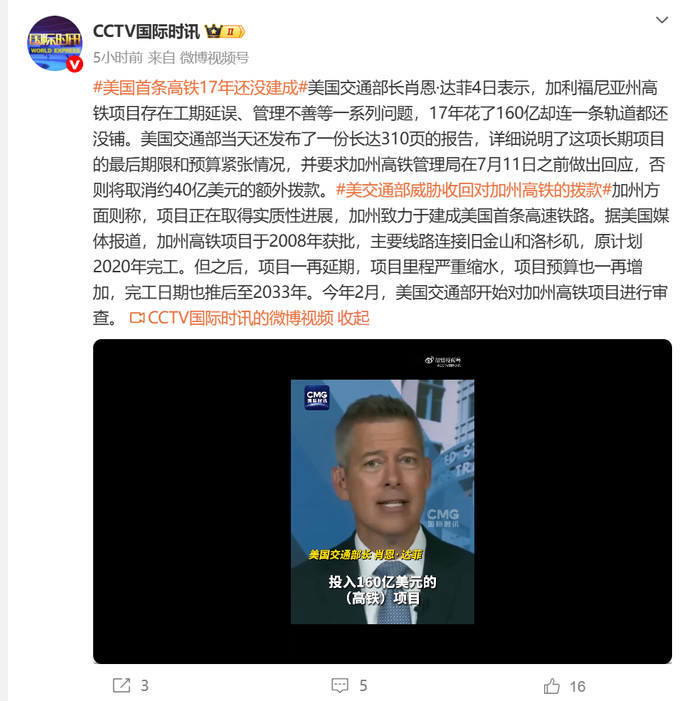 据CCTV国际时讯报道,美国交通部长肖恩·达菲4日指出,加利福尼亚州高铁项目深陷工期延误和管理不善的泥潭,17年间耗资160亿美元(约合人民币1150亿元),却未能铺设一条轨道。
