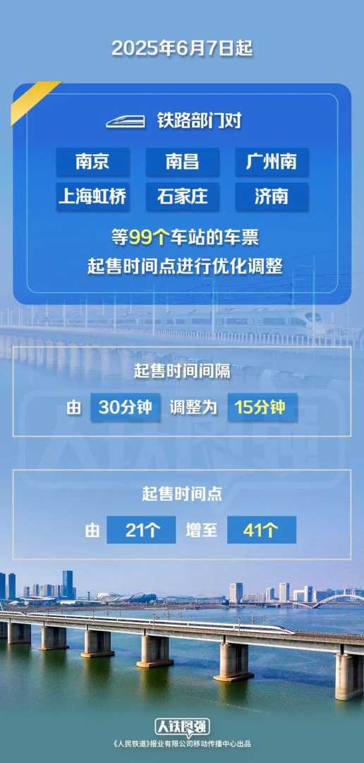 6月7日起,铁路部门对99个车站的车票起售时间点进行优化,起售时间间隔缩短为15分钟,起售时间点增至41个,方便旅客购票。请关注起售时间点变化,及时安排购票事宜。