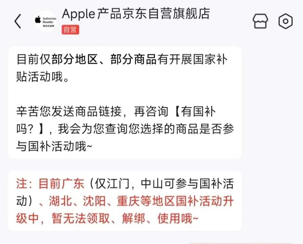 此外,Apple产品京东自营旗舰店公告显示:目前广东(仅江门、中山可参与国补活动)、湖北、沈阳、重庆等地区国补活动升级中,暂无法领取、解绑、使用。