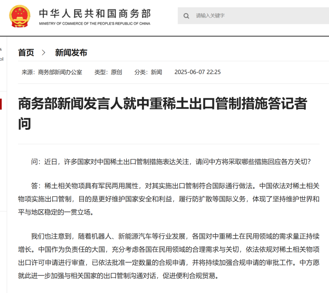 商务部:中国依法对稀土相关物项实施出口管制,旨在维护国家安全和利益,并已依法批准一定数量的合规申请,以满足国际民用领域对稀土的合理需求。