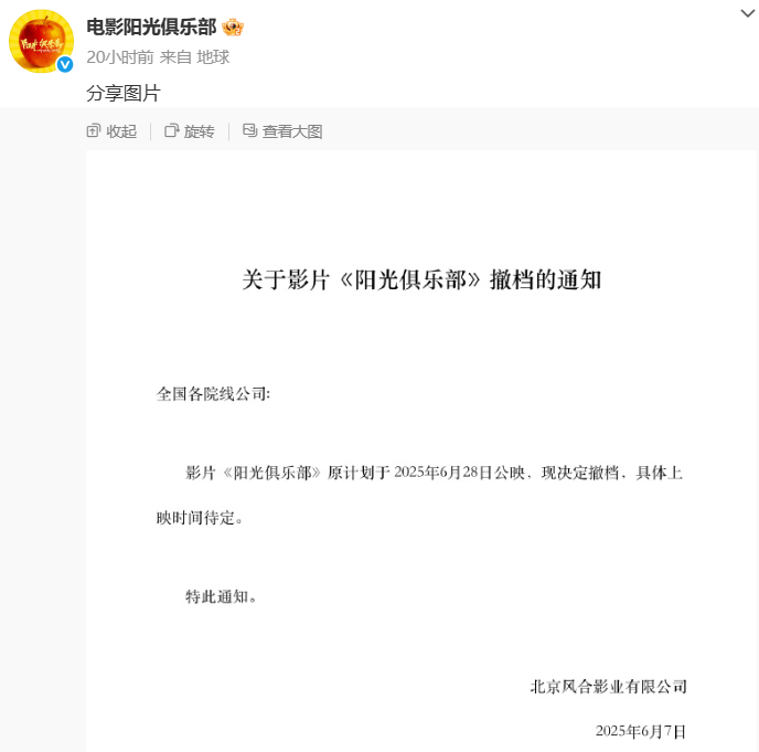 此前,5月28日,《阳光俱乐部》曾正式宣布定档6月28日。然而,此次撤档通知由北京风合影业有限公司发布,却暂未披露撤档的具体原因,让影迷们倍感遗憾。