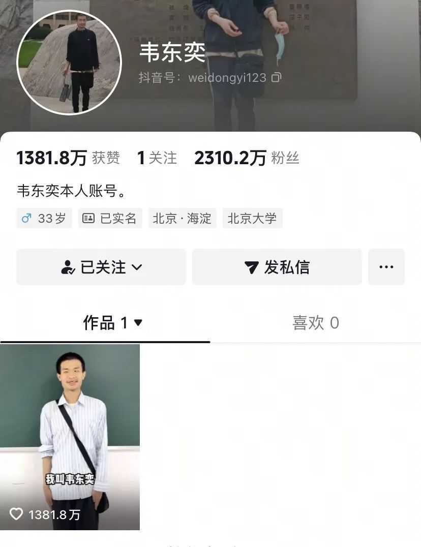 截至6月9日10时30分许,韦东奕的账号粉丝数量已飙升至2310万,显示了其极高的社会关注度。