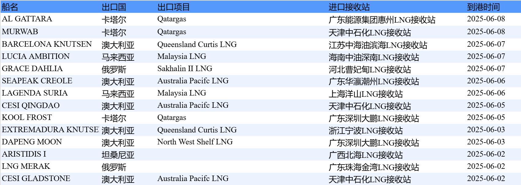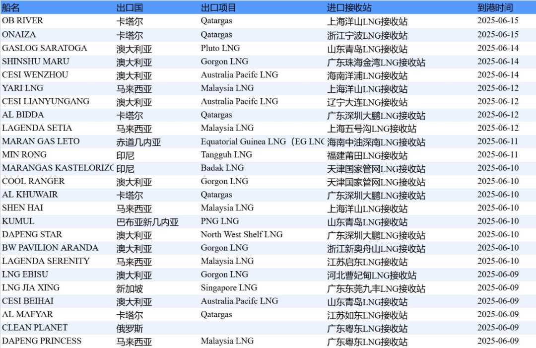 表1:6月2日-6月8日中国LNG进口分析