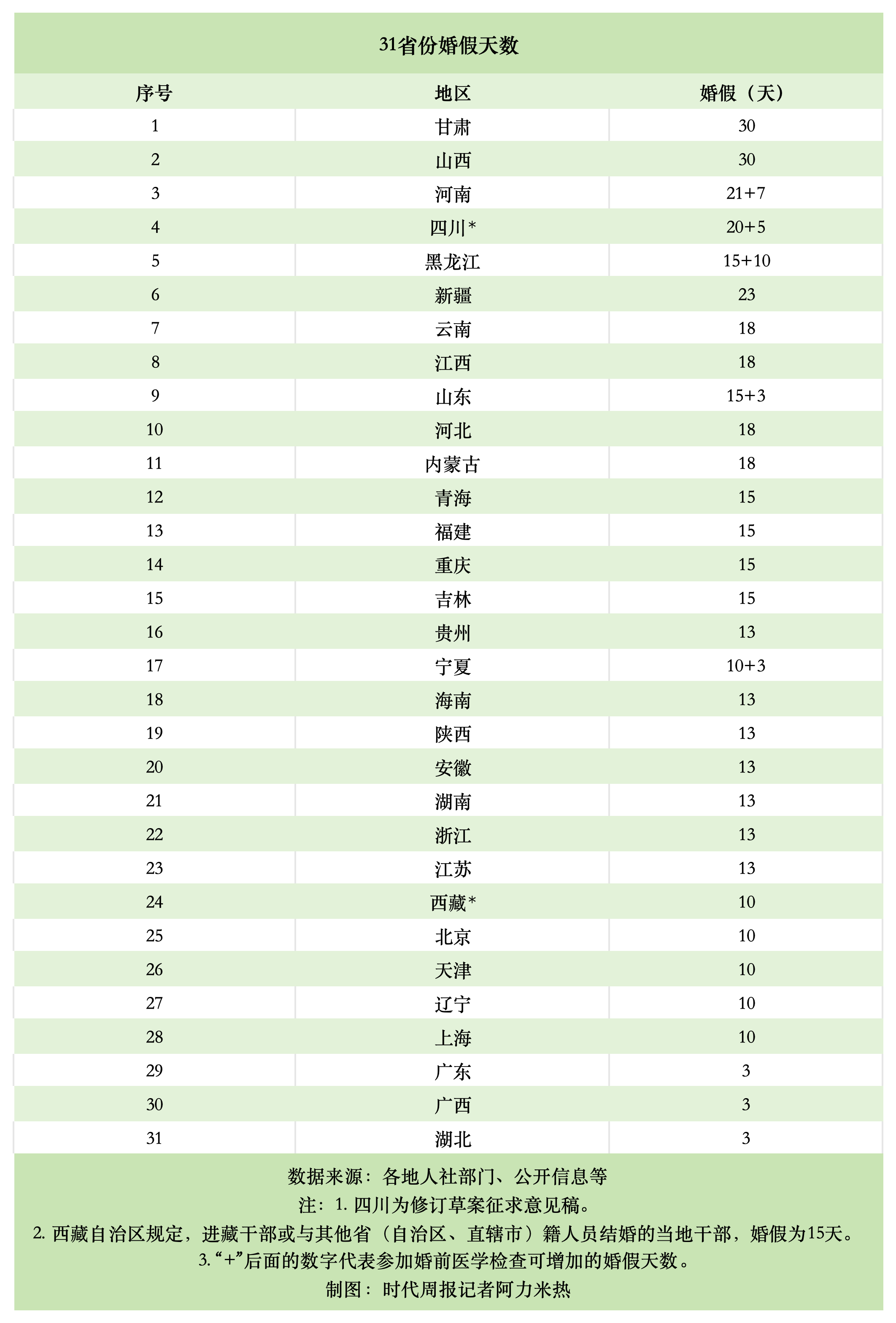 从全国来看,延长婚假已是大势所趋。目前已有27个省份在地方性法规中明确延长婚假。甘肃、山西婚假达30天,是全国婚假最长的省份。河南、四川、黑龙江、新疆等地婚假天数也达到20天以上。相比之下,广东、广西、湖北目前尚未延长婚假,仅执行3天法定婚假。