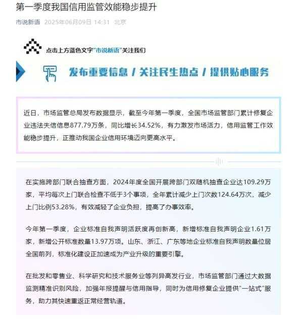 中国网财经6月9日讯 据“市说新语”微信公众号消息,近日,市场监管总局发布数据显示,截至今年第一季度,全国市场监管部门已累计修复企业违法失信信息877.79万条,同比增长34.52%,此举有力激发了市场活力,信用监管工作效能稳步提升,正推动我国的企业信用环境迈向更高水平。