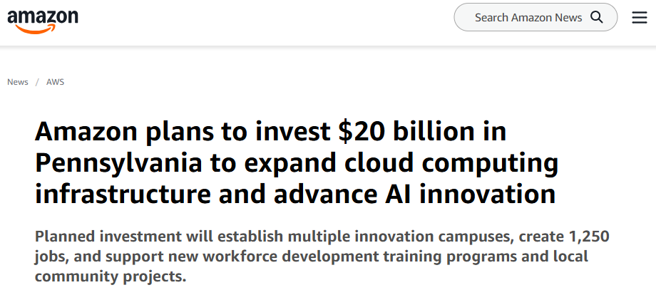 宾州州长乔希·夏皮罗表示,“凭借亚马逊至少200亿美元的承诺,我们赢得了该州有史以来最大的一笔私人投资。我们正创造机会,为社区创造税收,同时确保AI的未来从宾州出发,推动科技创新与经济发展。”