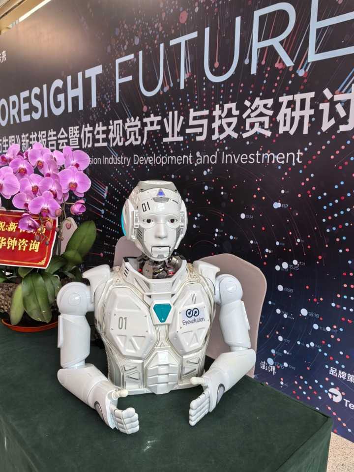 人形机器人“小黑”亮相《仿生眼》新书报告会暨仿生视觉产业与投资研讨会。