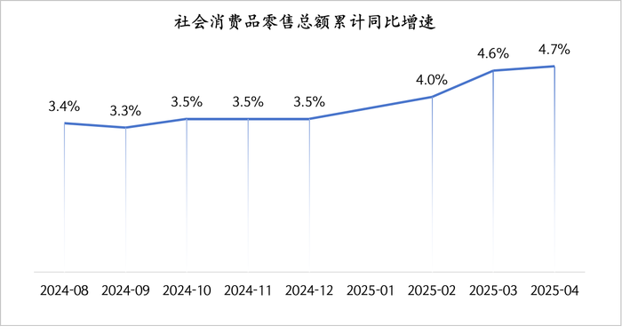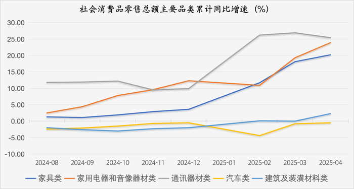 以旧换新政策助力下,2025年消费持续复苏。1-4月,社会消费品零售总额同比增长4.7%,增速较一季度加快0.1个百分点。其中,以旧换新政策相关消费品零售额增长显著。如家具类消费品零售额同比增长20.2%,家用电器和音像器材类同比增长23.9%。