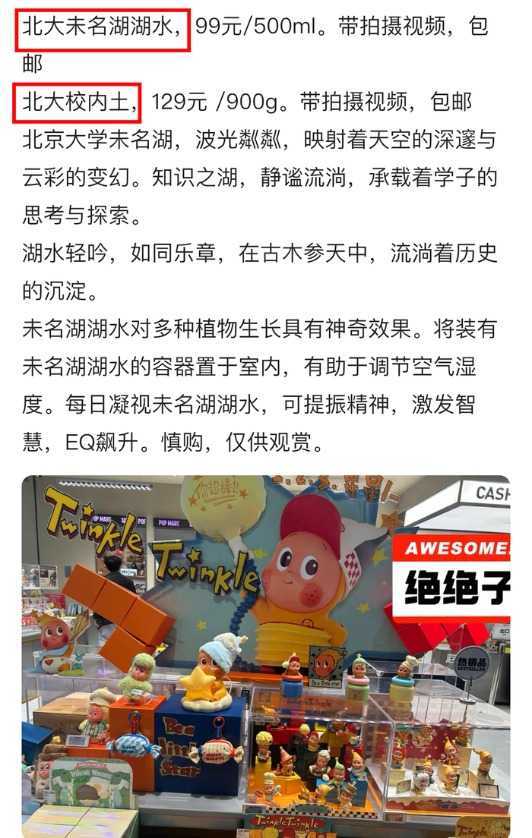 更有标价99元包邮的商家,不仅售卖未名湖水,还支持拍摄视频,甚至销售北大校内土,每900g售价高达129元。尽管卖家提醒“慎购,仅供观赏”,但仍吸引了不少关注。