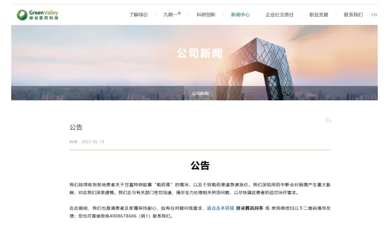 一位三甲医院神经内科医生表示,药品缺货的情况屡见不鲜,但持续几个月缺药的情况并不多见。针对甘露特钠胶囊缺货的情况,绿谷方面曾在官网发布公告回应,正与有关部门密切沟通,竭尽全力处理相关供货问题。但据21世纪经济报道,该公告于5月23日被删除。