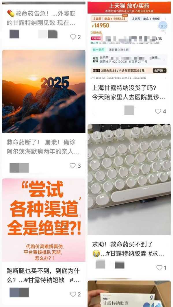 广州的陈女士(化名)表示,其82岁的母亲被诊断出阿尔茨海默病早期症状,开始服用甘露特钠胶囊。但5月初复诊时,医院就说“没药了”。她咨询了附近医院及药店,均回复无货。近几个月来,甘露特钠胶囊市场价格累计上涨约40%,部分药房甚至标出高达5000元/盒的“天价”。截至目前,该药在美团、天猫、京东等平台的普遍售价已涨至428元/盒—534.5元/盒。多位网友在社交平台表示“跑遍了都买不到一盒药”。