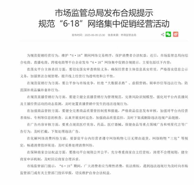 6月9日,市场监管总局针对618大促发布合规提示,要求综合电商、直播电商、跨境电商等平台企业公平参与市场竞争,杜绝“大数据杀熟”、虚假营销、刷单炒信等违法行为,并特别强调防范国补商品骗补套补行为。