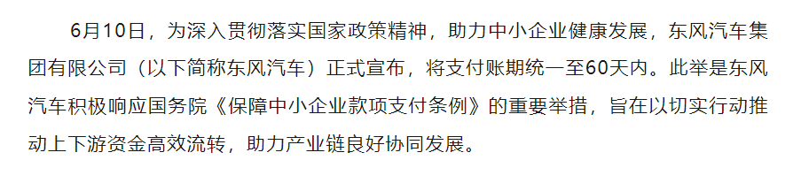 东风汽车表示,为助力中小企业健康发展,东风汽车将支付账期统一至60天内。