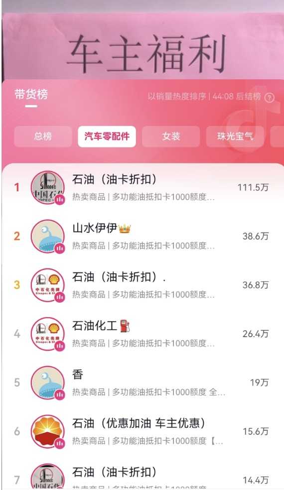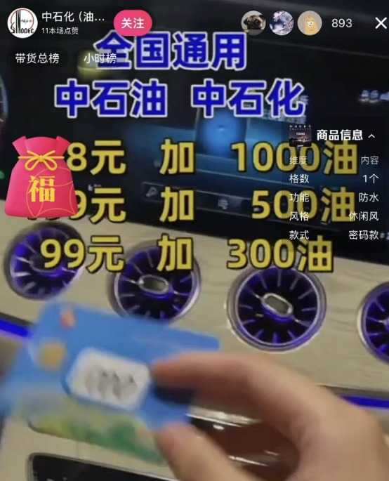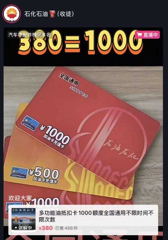 这些主播在直播间内叫卖各种面值的油卡,包括99元抵200、199抵500、388抵1000等优惠,吸引了大量观众。为增加可信度,一些直播间甚至用中石化logo做头像,账号名写作“石油卡折扣”,直播间内展示中石化面值1000元的正规油卡,但实际上并无中石化官方认证。